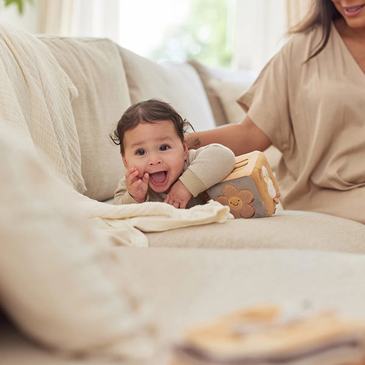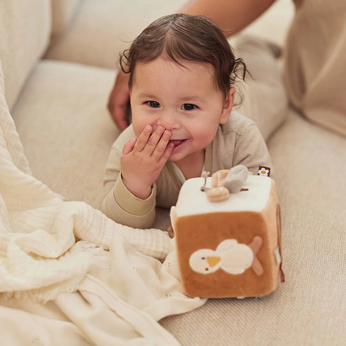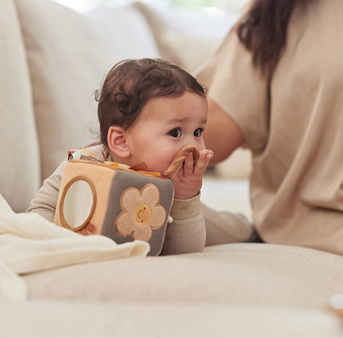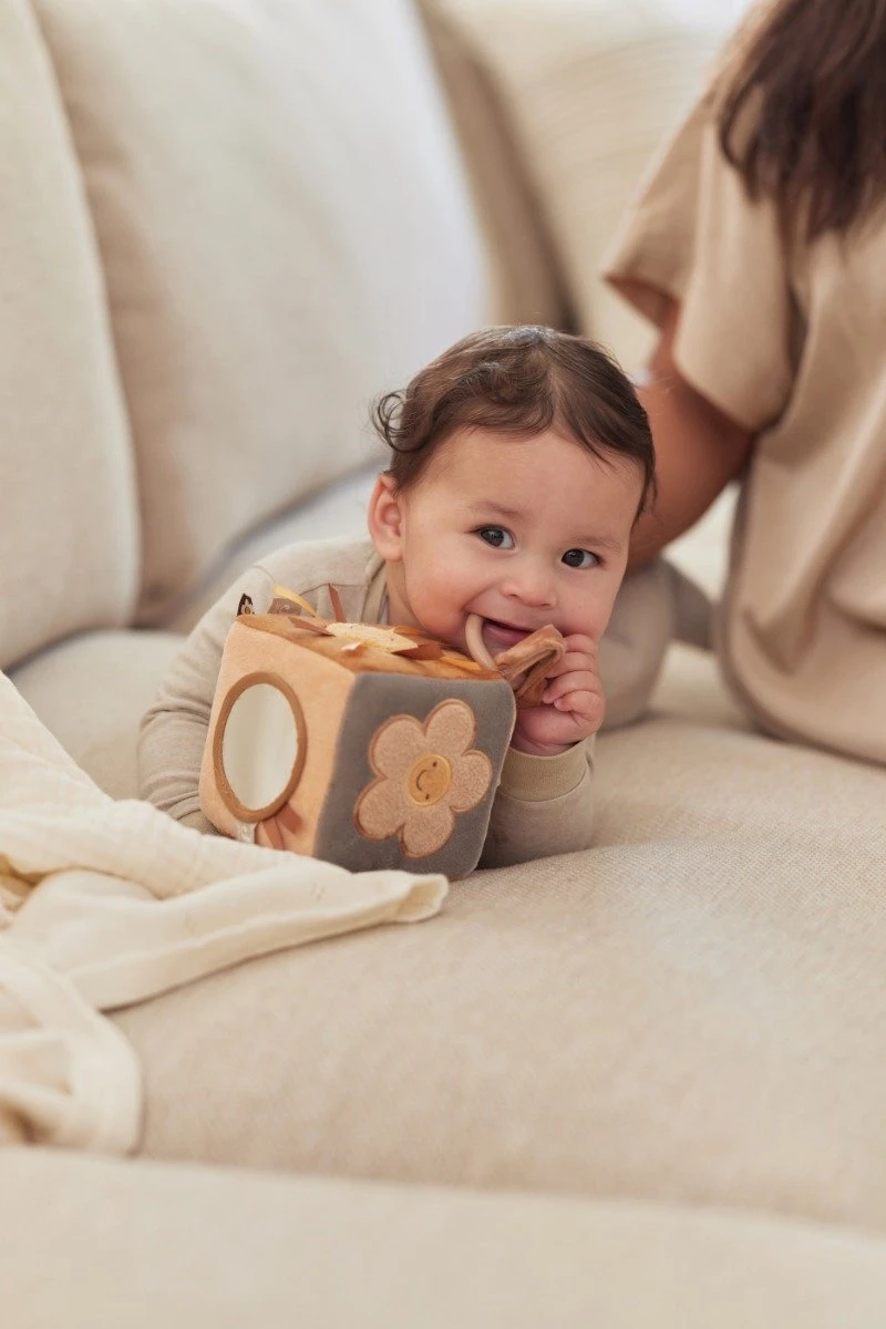 Een leuke en zachte activiteitenkubus voor jouw mini. De kubus is gemaakt van 100% velours en dus extra zacht voor jouw kleintje. Alle 6 de vlakken van de kubus hebben een andere functie, met als doel om de zintuigen van jouw kleintje te prikkelen en ontwikkeling te stimuleren. Bijvoorbeeld een babyspiegel, kleurrijke labeltjes en knisperende elementen. De kubus bevat een koortje met een plastic ring, zodat je de kubus gemakkelijk kunt vastmaken aan bijvoorbeeld de box of de kinderwagen.