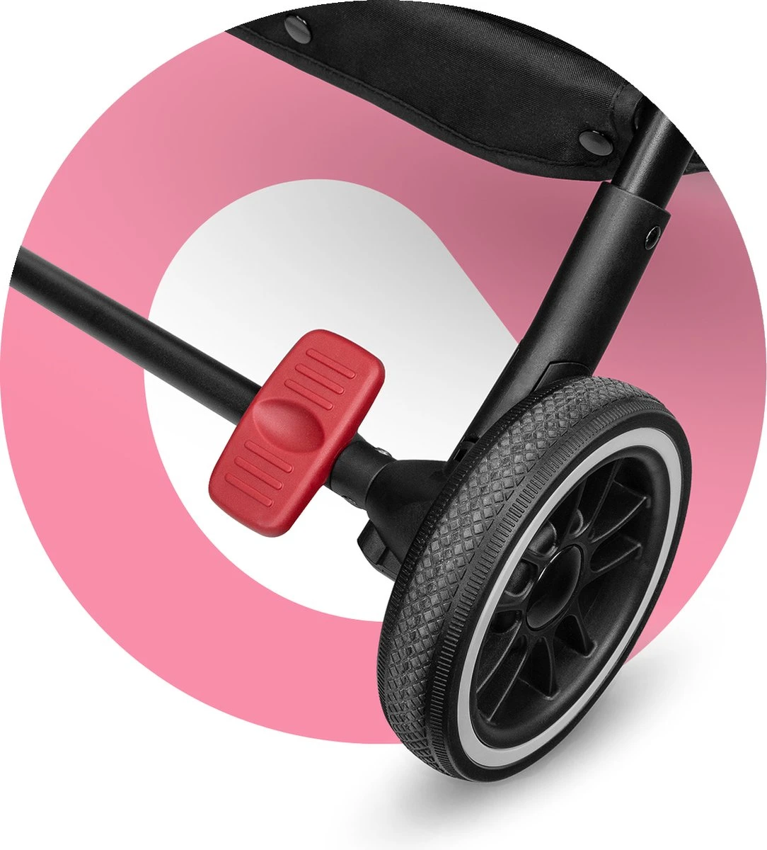 De voorwielen zijn gemakkelijk te manoeuvreren, waardoor de kinderwagen ongelooflijk wendbaar is. De rubber-polyurethaan bekleding garandeert duurzaamheid, rijstabiliteit en slijtvastheid. Schokdempers op alle wielen verminderen de schokken aanzienlijk tijdens het rijden op oneffen oppervlakken, en een comfortabele rem garandeert een uitstekende rijcontrole.