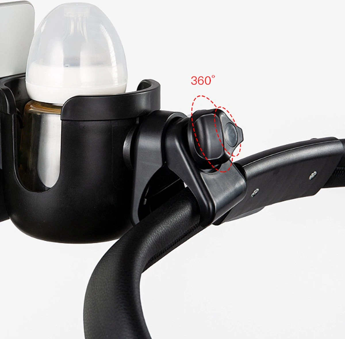 Met het aanpasbare klemsysteem klem je de bekerhouder gemakkelijk op de stang van de kinderwagen, buggy of fiets, en blijft deze stevig op zijn plek zitten.